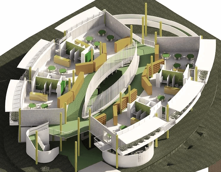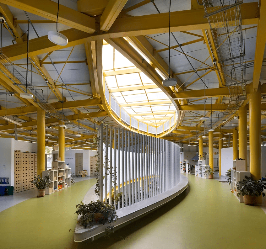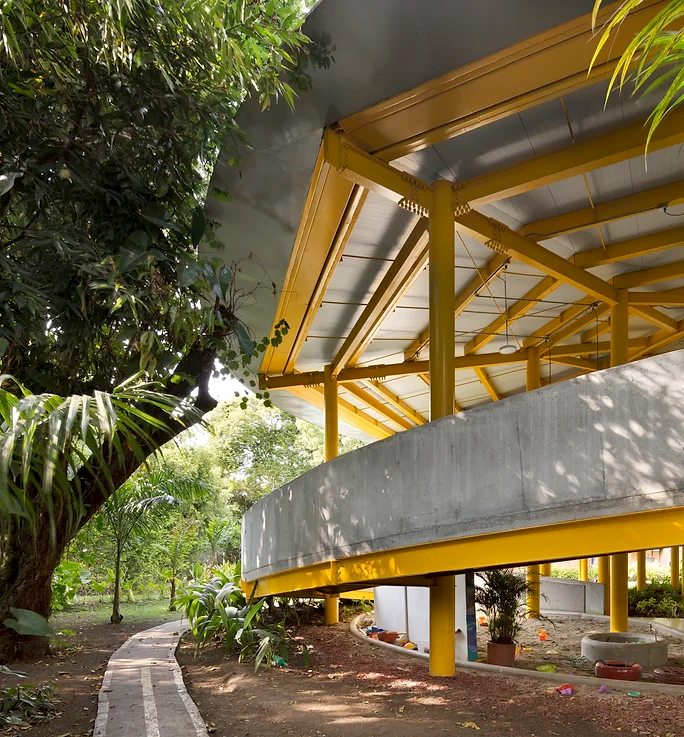 El proyecto reinterpreta la primera casa “Maloca” en conjunto con la forma de la hoja, haciendo énfasis en su orientación oriente – occidente. Dada su forma permite a los niños recorridos fluídos, correr, jugar, dar vueltas alrededor, lo que no sería fácil en un cubo. Elementos honestos y flexibles dan forma y vida al edificio.